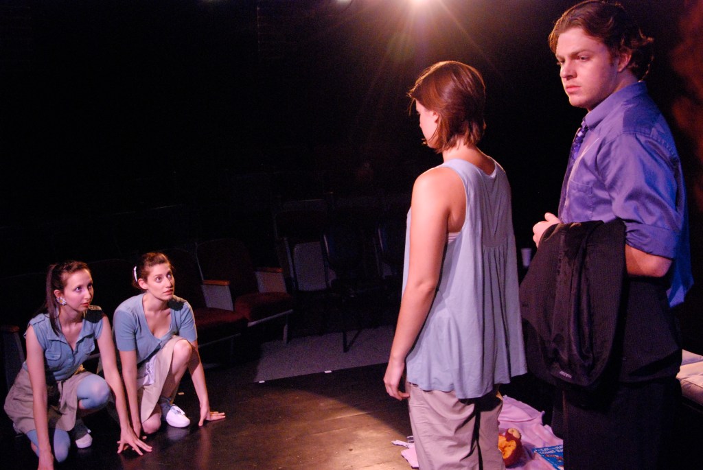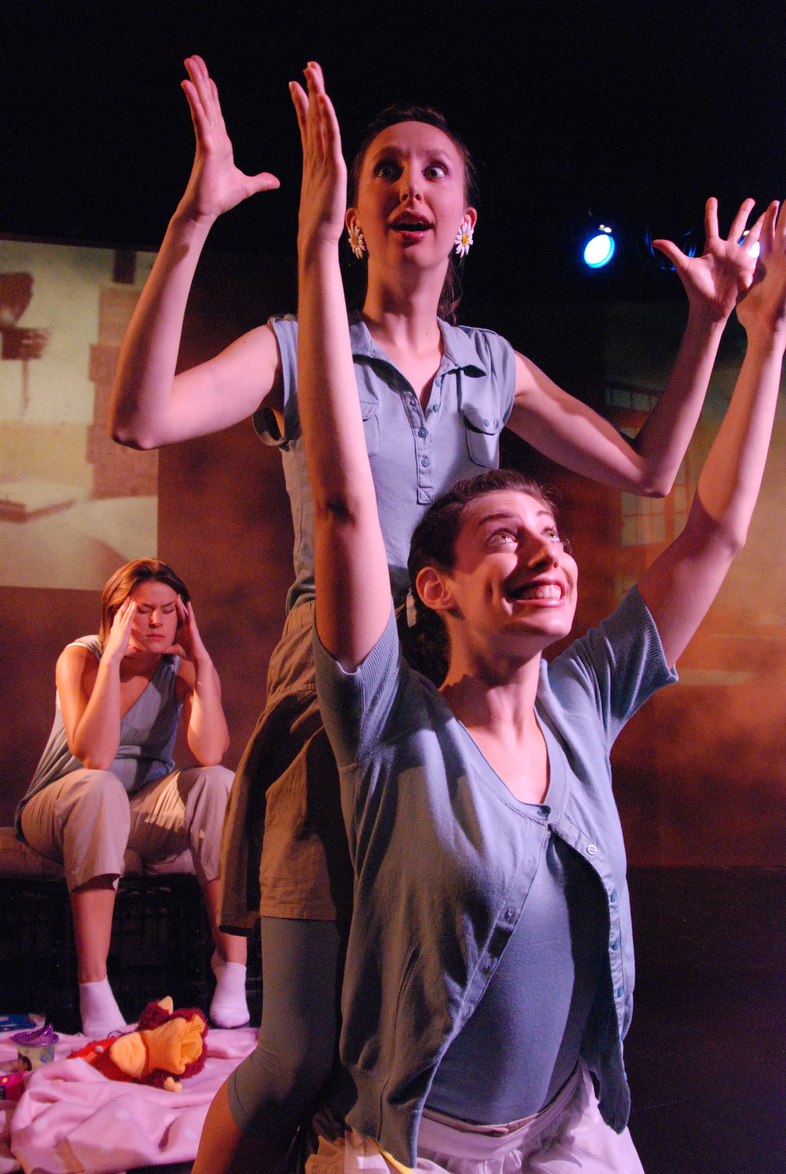 Two women negotiate an uncertain terrain of appropriate social behavior when DAISY shows up for dinner at LAURA’s home having invited along her invisible friend, John. As LAURA and DAISY propose a variety of frames for the situation, each offering chit-chat to try to establish a shared reality, M (an unexplained woman lying, asleep, on LAURA’s couch amid the domestic paraphernalia of early childhood and the detritus of a work-from-home situation) stirs fitfully, occasionally sleep-talking or rousing herself to participate in the conversation. A sometimes heated, sometimes frosty debate—about sex, communication, relationships, love, domestic life, gendered behavior, childbearing, parenting, meaning, and purpose—ensues, through which it becomes clear that LAURA and DAISY have different personal and political views of what makes life worthwhile. Simply by not interrupting her when she reveals her innermost thoughts to him, John seduces LAURA, which sets off an increasingly dramatic series of events: a birth, a murder plot, and an escape. When the cuckoo clock sounds, a CHILD begins to cry, and D arrives home from work, everything changes: LAURA and DAISY fling themselves into the unknown, leaving M behind to decide: are her days vapid or worse—a hell of repetition, expired opportunities, empty fantasies, and regret—or can happiness be found in the mundane and the quotidian?