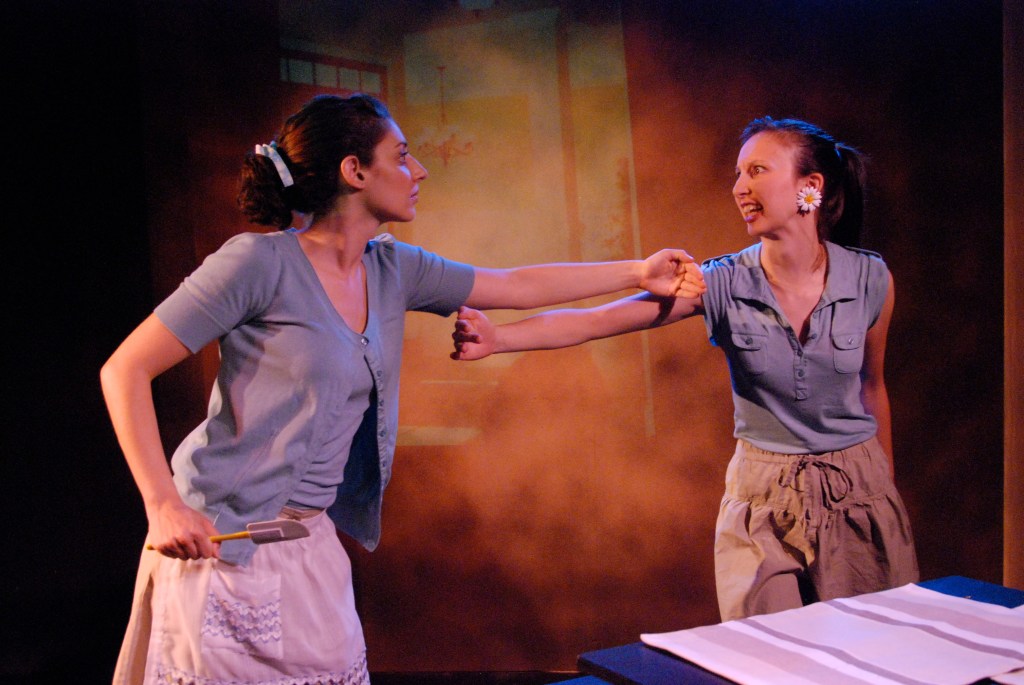 DAISY tries to wrestle the spatula out of LAURA’s hands. They tussle; they roll around the floor in hand to hand combat, LAURA holding the spatula and DAISY trying to get it from her. Occasionally, LAURA strikes out at DAISY and lands one; DAISY cries out. Wrestling, swatting and shouting, they circumvent the table as the family eats dinner. They come back to the threshhold; LAURA tries to push DAISY through and into the abyss. DAISY resists.